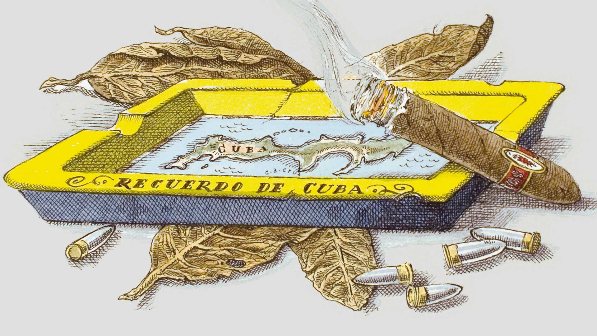 In a hotel of Havana, under the fixed sun of the Revolution : the fierce and partisan overtones of leather and tobacco meddle with the paneling’s waxen silence. In the cool dimness, fawn grimaces shimmer along with the smoke of cigars and the barrels of guns.