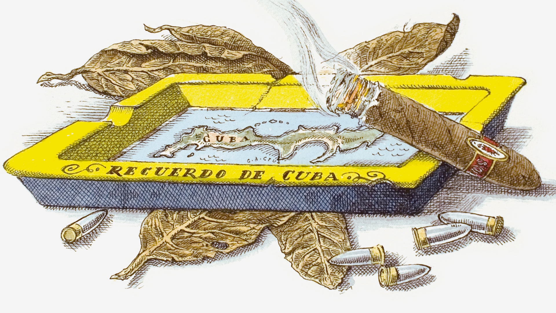 In a hotel of Havana, under the fixed sun of the Revolution : the fierce and partisan overtones of leather and tobacco meddle with the paneling’s waxen silence. In the cool dimness, fawn grimaces shimmer along with the smoke of cigars and the barrels of guns.
